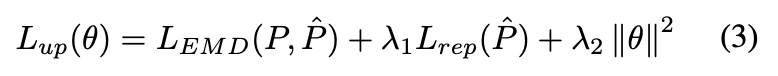 其中第一个项是上采样点集和 groundtruth 密集点云之间的地球移动距离 EMD(Earth Mover Distance):