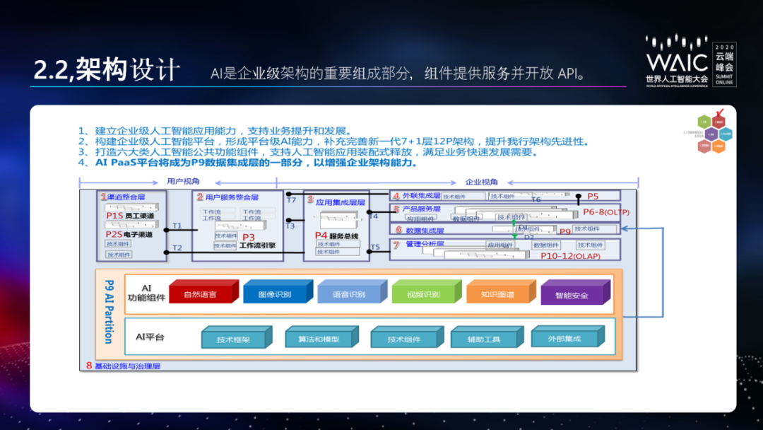中国建设银行总行金融科技部总工程师胡宪忠表示,将人工智能视角的企业级结构 6 层次设计集成到原有的企业架构中,才能实现建行的人工智能即服务(AIaaS)目标。而 AI 是企业级架构的重要组成部分。