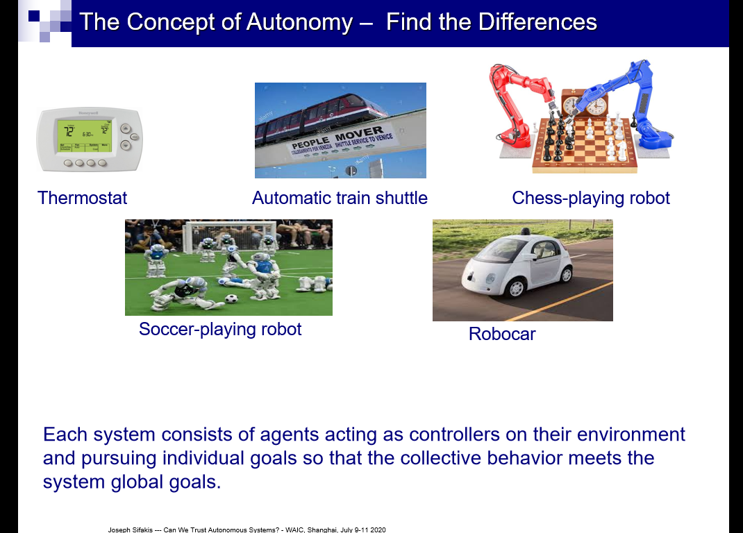 Sifakis 以恒温器、自动轻轨列车、无人驾驶汽车以及象棋和足球机器人为例,详细阐释了自治的概念。他表示:「每个自治系统包含一些在环境中充当控制器且追求个体目标的智能体,所以集群行为能够满足系统的全局目标。」