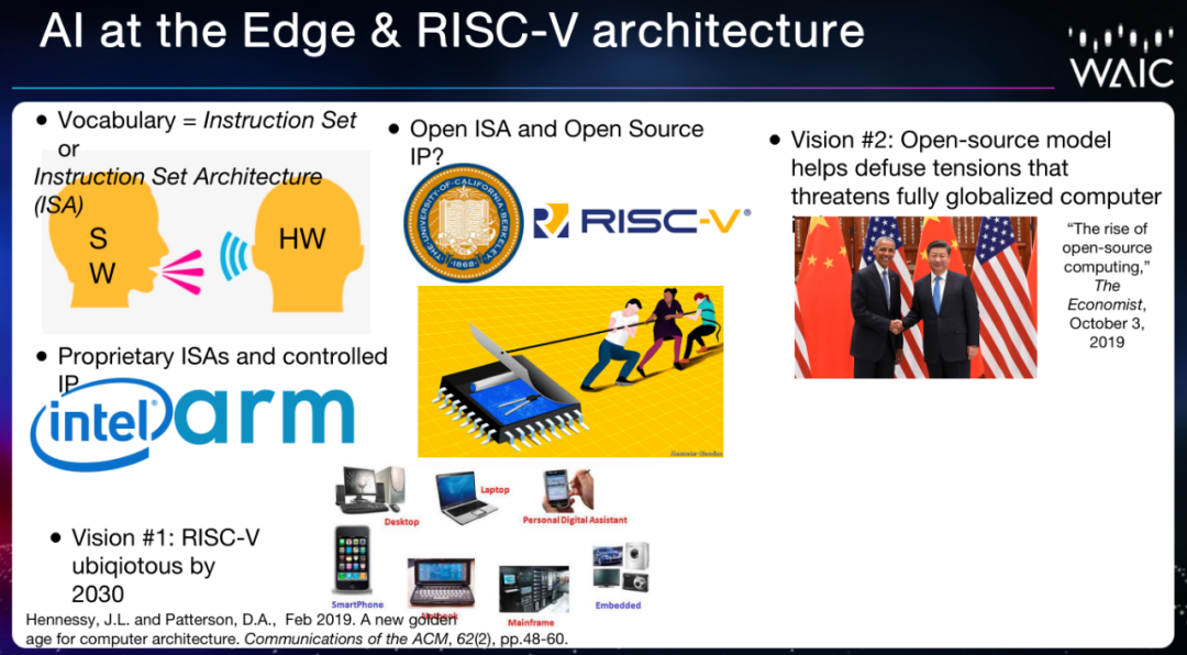 以适用于边缘计算设备的阿里平头哥玄铁 910 芯片和初创公司 OURS 开发的 Pygmy 芯片为例,David Patterson 介绍了 RISC-V 架构在边缘计算芯片中的作用。