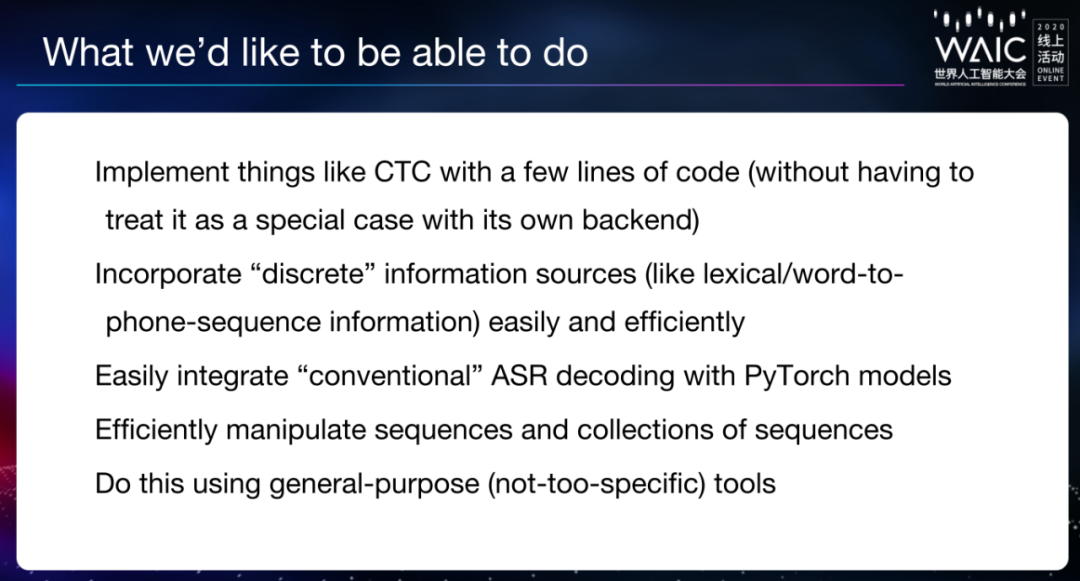 他提到,在人们建立语音识别系统时,此类系统通常是两种不同事物的混合体,一种类似 PyTorch 和 TensorFlow,另一种类似 OpenFst。而这二者之间的连接并不容易。
