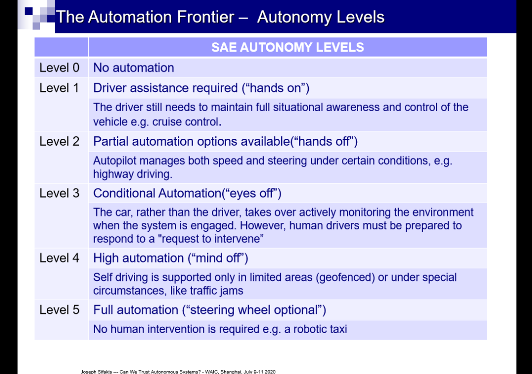 下图为 Sifakis 列举的自治等级(Autonomy Level):