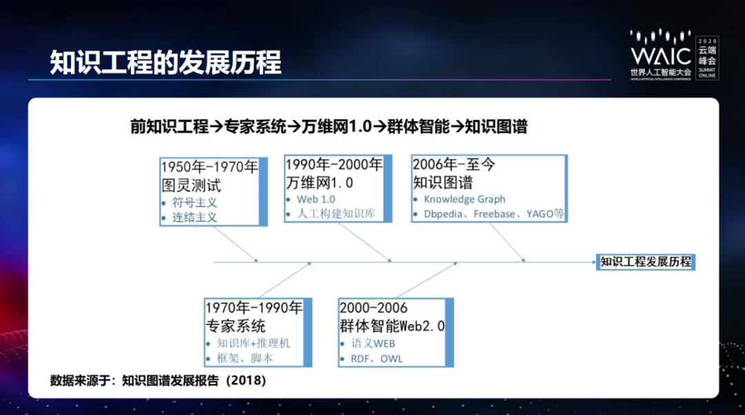 吴信东首先介绍了知识图谱与数据图谱之间的关系,表示现有 99% 的知识图谱实际上是「缺少知识」的数据图谱,并简要概述了知识图谱的定义及发展历程。