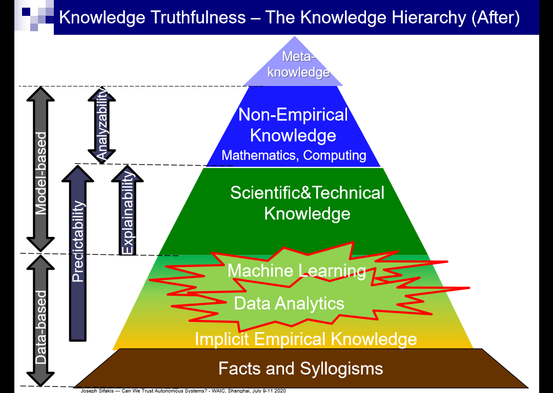 接着 Sifakis 谈到了知识的真实性。他指出,每个人都了解什么是知识,大脑结合快速和缓慢两种思维系统来产生知识。同时提出以下类比:神经网络生成知识类似于快速思维,常规计算机生成知识类似于缓慢思维,通过有意识和努力的思考产生。