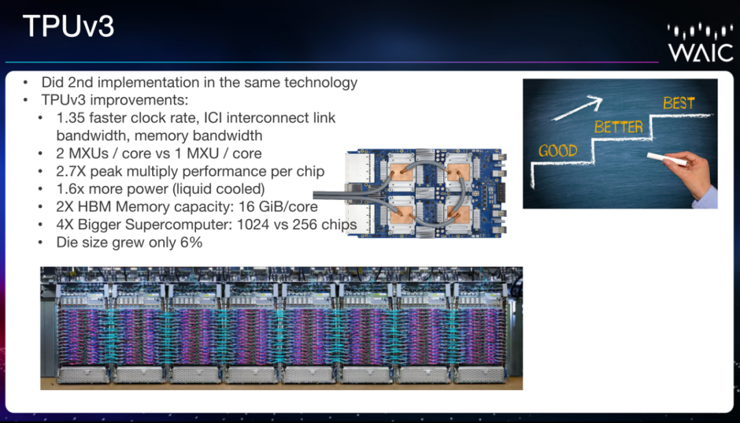 David Patterson 在演讲中介绍了谷歌为云端开发的 TPU 系列芯片,以及当前 v3 版本的卓越性能。