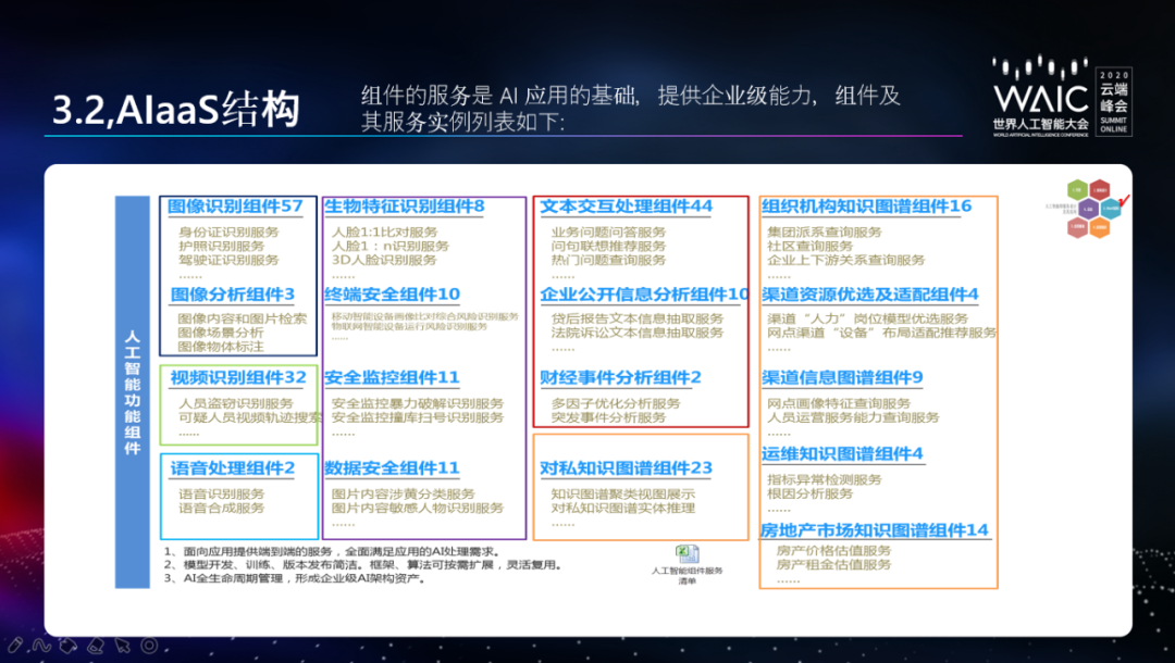 紧接着,胡宪忠介绍了 AIaaS 结构。其中,AI 功能组件分为 6 大类,分别是图像识别类、智能安全类、自然语言处理类、视频识别类、语音识别类和知识图谱类。这些 AI 功能组件旨在提升企业的智能化能力,提供服务目录供应用组件和应用调用。