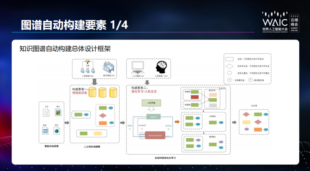 那么,如何自动构建知识图谱呢?吴信东首先提供了总体设计框架,分为数据自动获取、三元组自动抽取以及自动纠错和自主学习三步。其中又涉及「领域知识库」和「强化学习 + 人机交互」这两个构建要素。