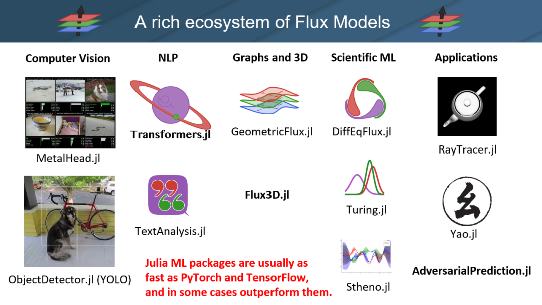 在过去的一年,Julia 社区贡献了许多模型。在 CV 方面,他们贡献了图像识别和对象检测模型;在 NLP 方面,他们有用于翻译的 Transformer 模型;在 3D 图形方面,Julia 的 GeometricFlux 和 Flux3D 软件包要优于 Pytorch 和 TensorFlow 中的同类框架。
