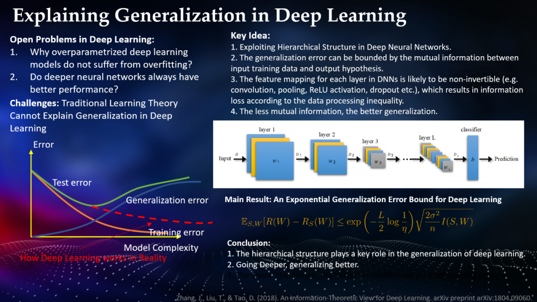 为了填补这一空白,2018 年,陶大程等研究者对这些问题进行了探索。通过使用强大的数据处理不平等信息理论(data processing inequality information theory),他们证明了:随着信息损失层(如卷积池化层)的增多,预期的泛化误差将以指数速度降至零。此外,网络越深越好的实证观察是基于小训练误差得到的。