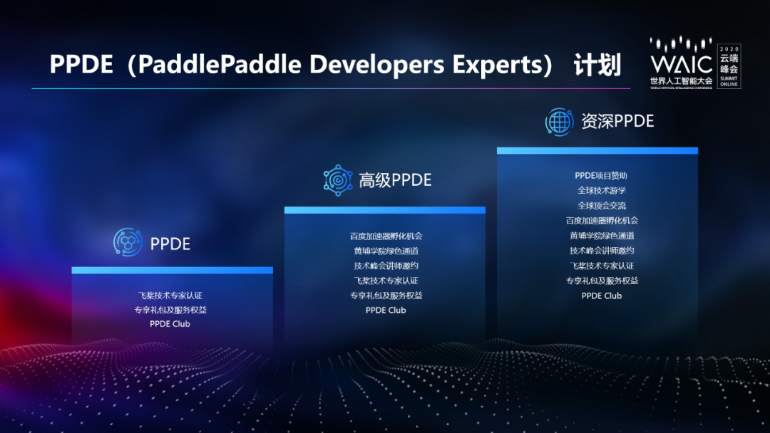 吴甜表示,百度还基于飞桨平台推出了 PPDE(PaddlePaddle Developers Experts)计划,为不同层级的人才提供不同的权益,包括技术专家认证、黄埔绿色通道、全球顶级会议的交流机会等。