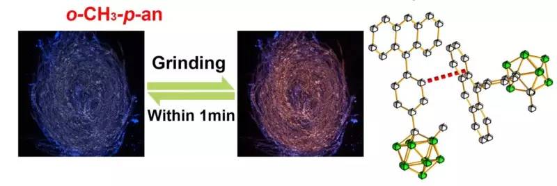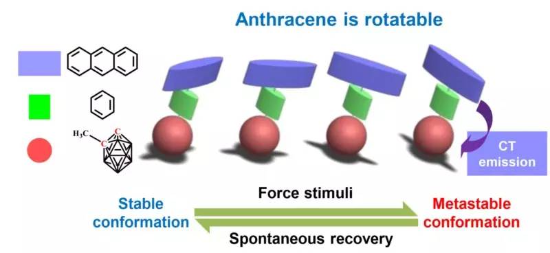 燕红课题组首先关注力致变色材料,因其对外界力的刺激做出响应可用在压力传感、光学信息存储等领。通常该性质用于非易失性存储器,然而固态下较强的分子间相互作用导致易失性存储器难以实现。该课题组将碳硼烷基元引入到蒽发光团形成“D-p-A”构型发光分子,实现了此类自修复力致变色材料(Chem. Commun. DOI: 10.1039/c6cc07093k)。研究发现碳硼烷的存在使得化合物可以通过力调控固态分子内电荷转移实现力致变色响应,该响应还可在1分钟内完成自修复恢复到原始状态(图1),具有易失性存储器需要的性能,显示出潜在应用前景。