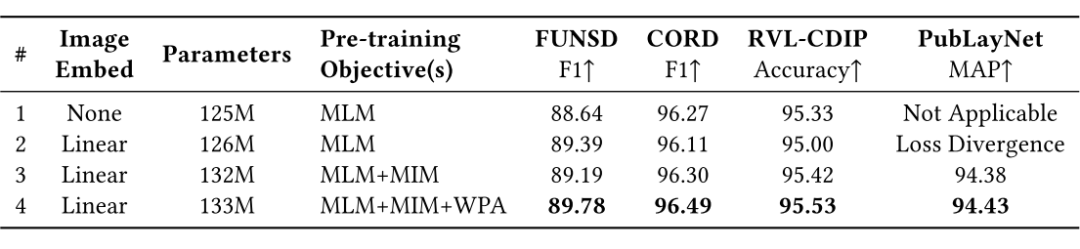 3. LayoutLMv3 使用消融实验来证明 MLM、MIM、WPA 几个任务的有效性。