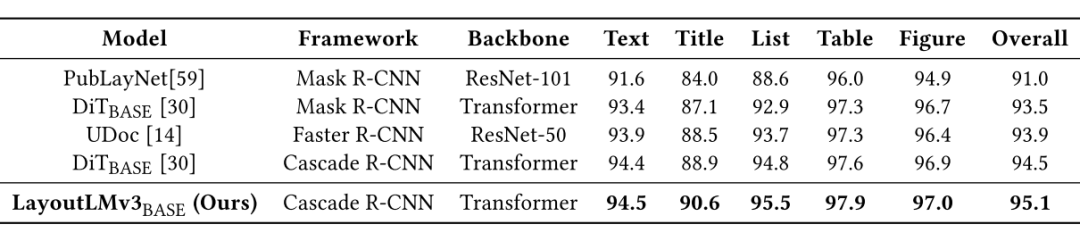 2. LayoutLMv3 在传统的视觉任务(PubLayNet)上进行 fine-tuning 的效果。