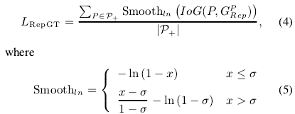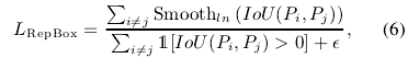 因为LRepBox是使得预测框Pi和周围的其他预测框Pj尽可能远离,Pi和Pj分别匹配上不同的目标框,它们之间的距离采用的是IoU,则RepBox loss定义为: