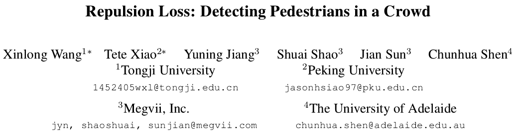 与通用目标检测相比,遮挡情况在行人检测中更为普遍,为此也是行人检测领域最广为关注的问题之一。现实场景中行人的遮挡情况主要分为两种情况:一种是其他物体对行人的遮挡,这往往会带来目标信息的缺失,进而导致漏检;另一种是行人个体之间的相互遮挡,这往往会引入大量的干扰信息,进而导致更多的虚检。本文重点解决的是后一种情况导致的遮挡问题。作者将对这一问题进行了深入思考,并从loss的层面提出了一种新颖的解决方案,为我们呈现了一场思路和实验都十分精彩的盛宴。