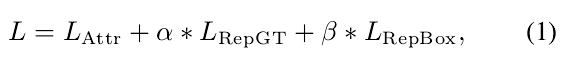 其中第一个子模块LAttr是使得预测框和匹配上的目标框尽可能接近;第二个子模块LRepGT是使得预测框和周围的目标框尽可能远离,第三个子模块LRepBox是使得预测框和周围的其他预测框尽可能远离。