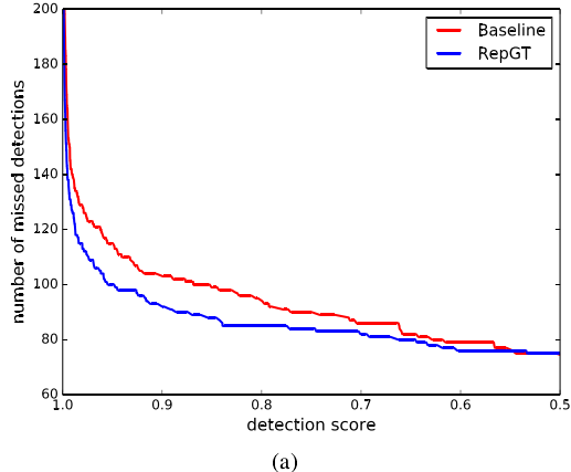 针对以上分析,作者决定从loss层面来解决行人之间的自遮挡问题,首先我们直观感受下本文方法RepGT的有效性,如下图所示:图(a)展示了RepGT对漏检的有效性,可以发现在detection score较高时,RepGT的漏检更少,图(b)展示了RepGT对自遮挡情况下的虚检的有效性,可以发现RepGT的虚检中自遮挡所导致的虚检比例更低。