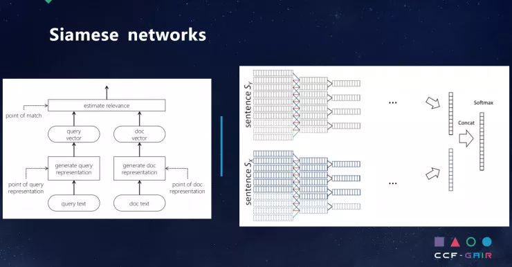 像 CNN 的 ARC-1 就是 Siamese 网络典型的例子,Siamese 网络比较直观,它的想法很简单,把两个输入用同样的编码器做一个表达,把表达做出来以后,可以用一个模块来做相似度的计算,它的特点是共享网络结构和参数。右边是具体的实现,可以用 CNN 实现 Encoder。