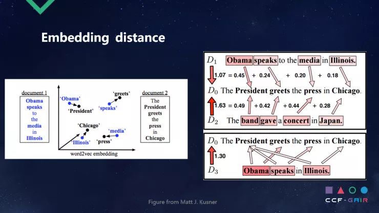WMD 是 2015 年的工作,它用了一些更加新的方法来算这种距离,这样的方法比简单的平均化求距离要更好一些。但存在一个问题,这种方法对多义性的解决不太好。