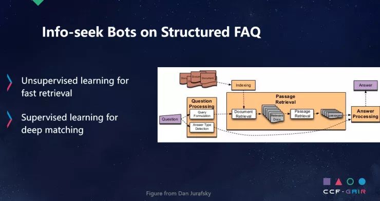 他重点描述了第二种类型,即如何让问答系统解决用户的信息获取类问题。围绕这一类型,他讲解了智能问答系统的基础架构,以及非监督学习和监督学习在这里所起的作用。