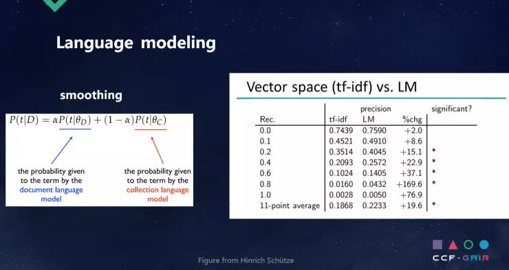 不同平滑的方法对应不同的语言模型。从实践角度来看,TF-IDF 和语言模型比较,语言模型有比较大的提升,可以看到图右几项比较里有五项取得显著提升。