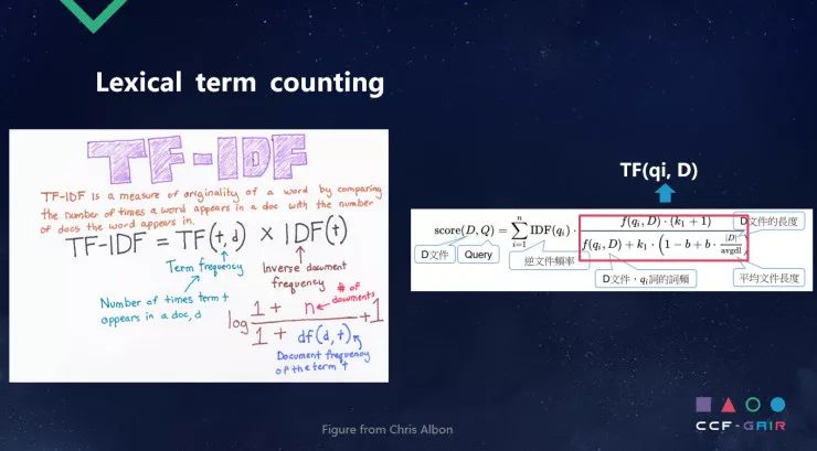 此后,他阐述了目前业界较为通用的快速召回方案:第一种,基于词汇计数(Lexical term counting)的方法;第二种,基于语言模型的方法;第三种,基于向量化的方法。
