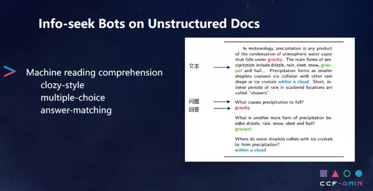 刚才讲的是结构化文档构建的情况。在实际场景下,结构化的数据很少,因为结构化意味着人力的投入,意味着很多人要去做数据标注、做知识库的构建。目前非结构化的数据更多一些,这也是我们团队研究的重点,也是我们认为非常有前景的方向,即如何在非结构化文档里寻找信息和答案。