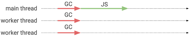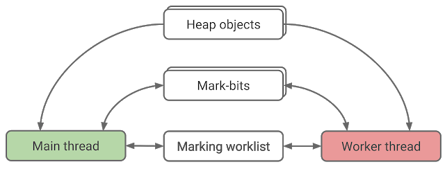 当工作线程正访问堆内存上的对象时,并发标记允许 JavaScript 在主线程上运行,这为许多潜在的数据竞争(data races) 打开了大门。例如,当工作线程正在读取字段时,JavaScript 可能正在写入对象字段。数据竞争可能会让 GC 错误地释放活动对象或将原始值与指针混合在一起。
