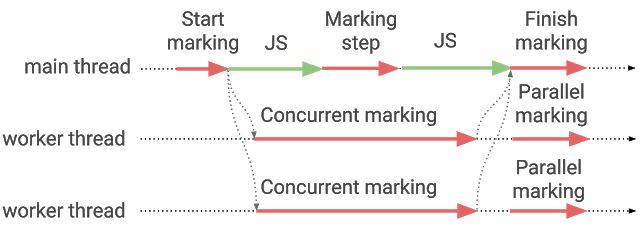 由于 write-barrier 会有消耗,增量标记可能会降低应用程序的吞吐量。通过使用额外的 worker threads 可以提高吞吐量和暂停时间。有两种方法可以在 worker threads 上进行标记:平行标记(parallel marking)和并发标记(concurrent marking)。