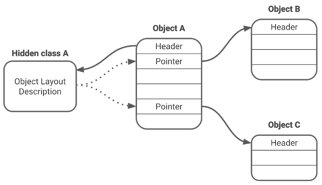 我们可以将标记视为图遍历(Graph traversal)。堆内存上的对象是下图中的节点,指针从一个对象指向另一个对象是图的边缘。给定图中的一个节点,我们可以使用该对象的隐藏类找到该节点的所有外边缘。