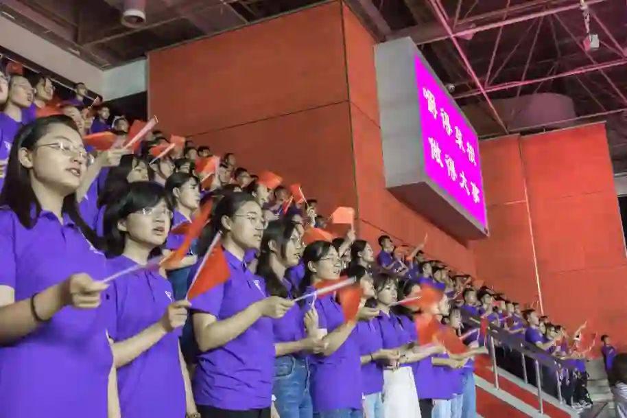 国旗护卫队踩着庄严的步伐将国旗迎到台上,让大家瞬间肃然起敬、热血沸腾,全体新生齐声高唱国歌,整齐而又响亮的国歌声响彻方肇周体育馆,小蓝鲸们在南大的精彩生活正悄悄拉开帷幕!