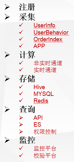 “User Profile”作为大数据的核心组成部分,由典型的大数据模型构成。包括注册、采集、计算、存储、查询、监控六大功能。