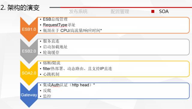 第二代 SOA 主要就是为了解决第一代 SOA 瓶颈问题,改为服务直连。SOA 仅作为治理和注册,在调用方应用启动时从治理平台获取服务端的 URL,并存到内存中,之后调用方就可以直接调用,第二代 SOA 的口号是“直连和去 ESB”。