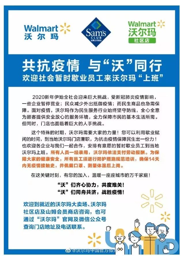 2月4日,生鲜传奇、沃尔玛、金虎便利等多家公司相继发出了“共享员工”的邀请,欢迎暂时歇业的员工前去“上班”。
