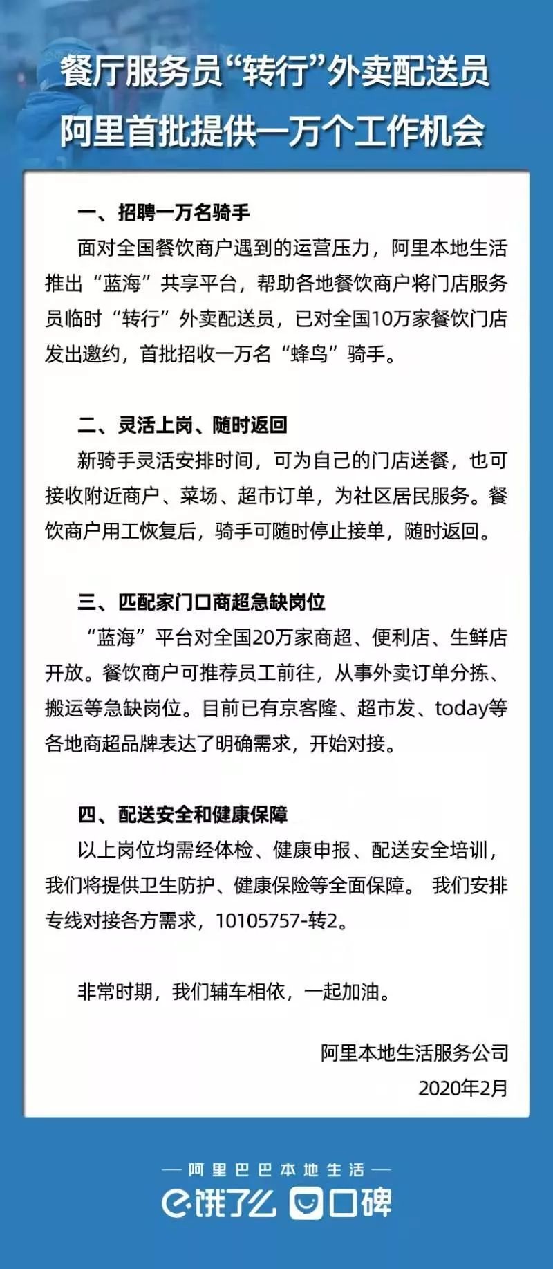 2月6日,阿里本地生活服务公司推出“蓝海”就业共享平台,餐饮商户可以通过该平台推荐员工报名成为“蜂鸟”骑手。新骑手灵活安排时间接单,也可为自己的门店送餐,商户用工恢复后可随时停止接单,随时返回。“蓝海”计划第一批招收1万名“蜂鸟”骑手,即饿了么小哥。