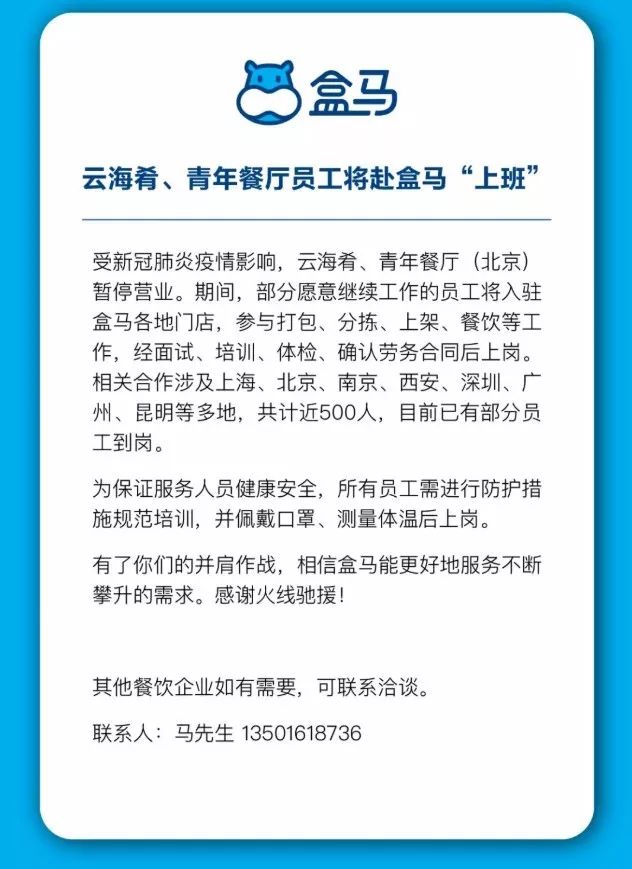 2月3日,盒马宣布联合云海肴、青年餐厅等餐饮企业,合作解决现阶段餐饮行业待岗人员的收入问题,缓解餐饮企业成本压力,和商超生活消费行业人力不足的挑战。