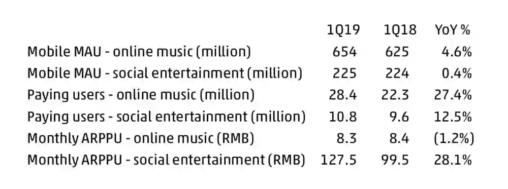 今天,腾讯音乐娱乐集团发布了截至2019年3月31日的第一季度财报。总体来说各项数据都不错——