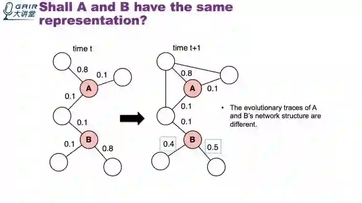 第一个模型是Dynamic Network embedding。下面是A和B的拓扑特征图。从图中,连接A的几个节点,相互之间也有了连接,可以看出A的影响力比B大。
