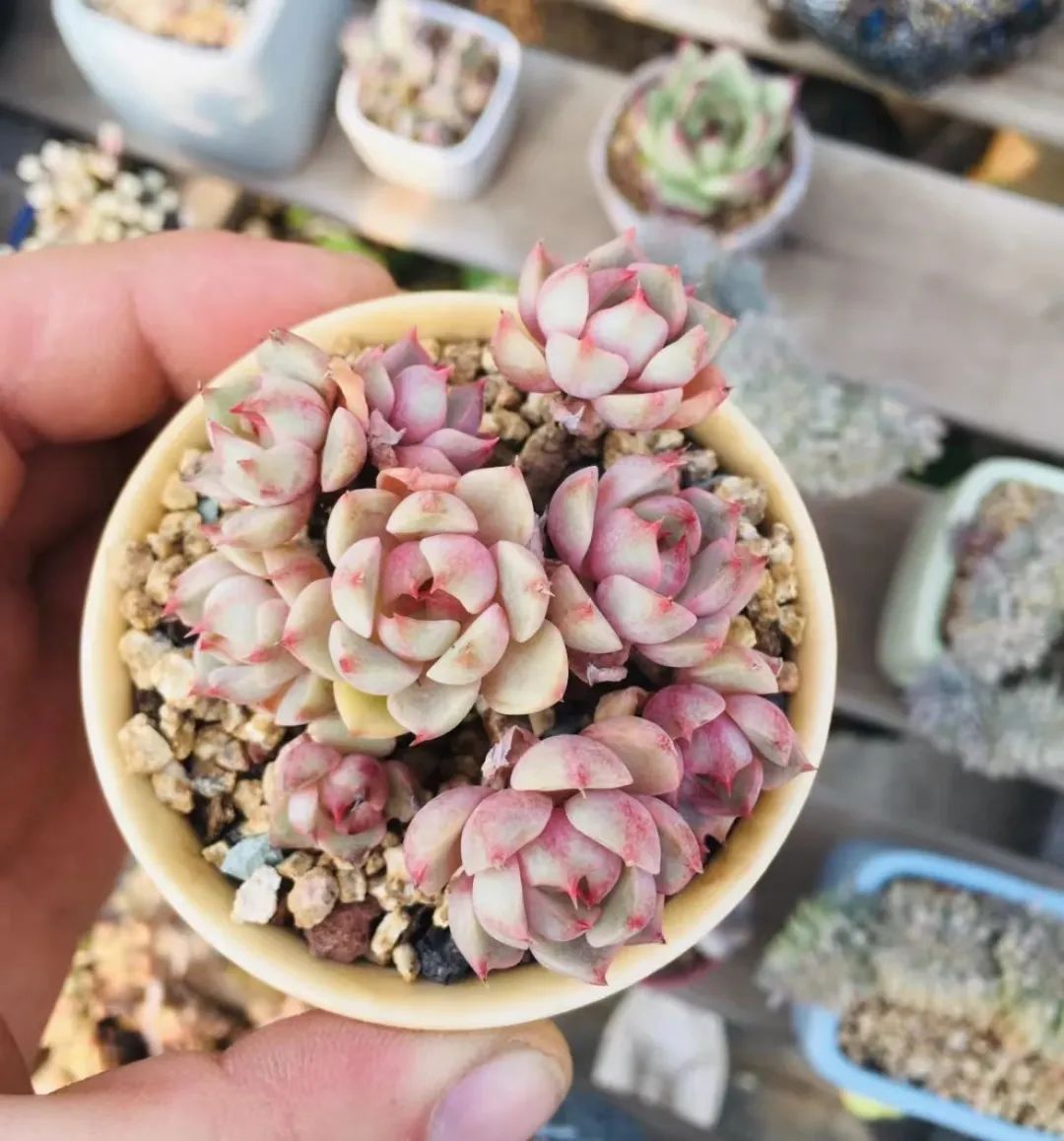 王进进还记得,在千禧年初,多肉刚刚引进时,小小一颗就卖100多块,物以稀为贵。经典的白菊,一盆按“头”收费,一个“头”就40块钱。而现在,价格已经落到2-3块钱,随便就能往家里招呼一盆。