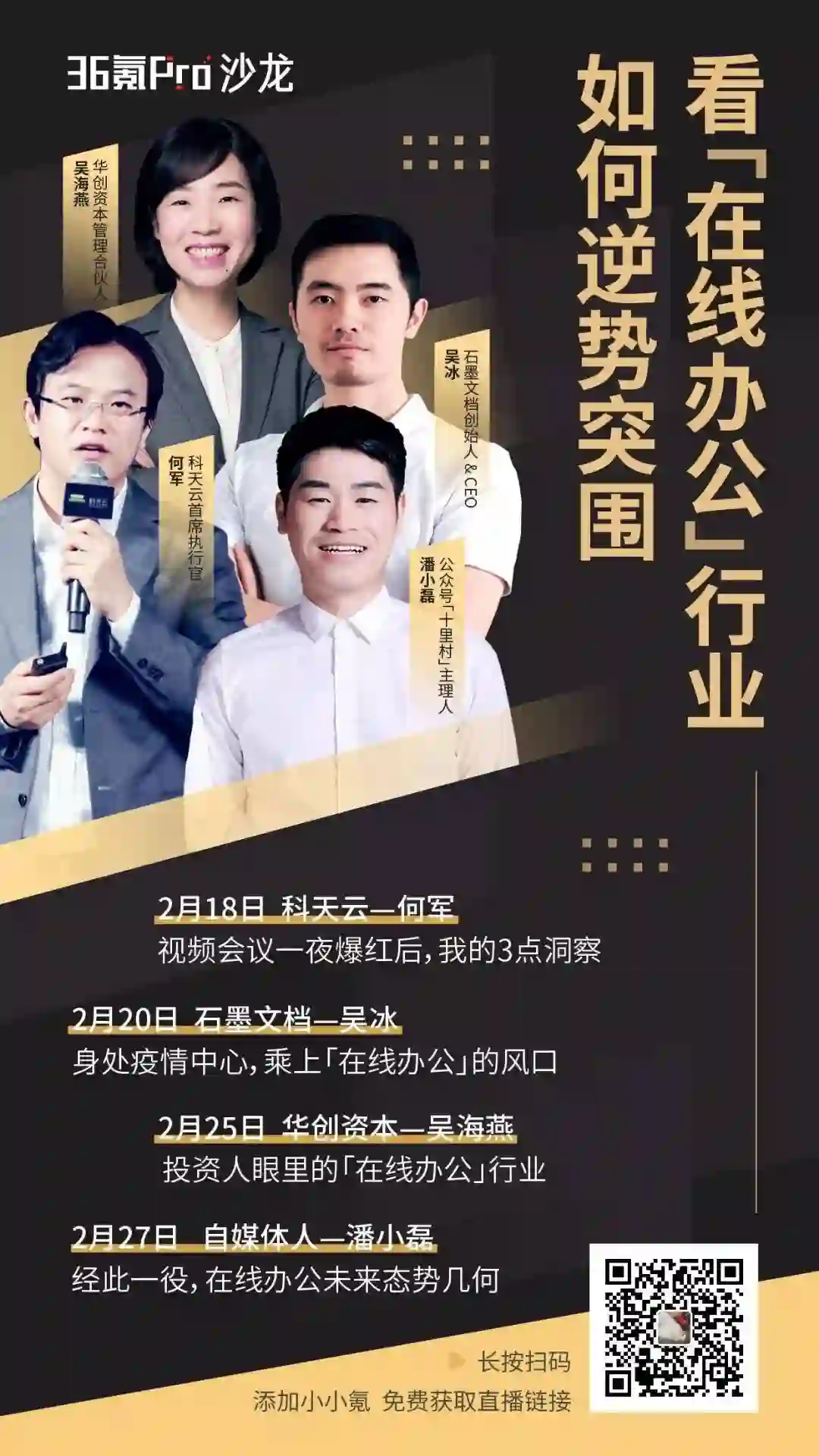 「在线办公」系列沙龙中,我们邀请了科天云CEO何军,石墨文档CEO吴冰、华创资本管理合伙人吴海燕、行业观察者潘小磊;