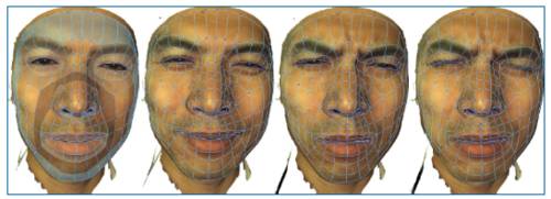 计算机视觉中一个很重要的问题是动态曲面追踪(如图3),即给定一系列动态三维曲面,如何自动找到曲面间的光滑映射,使得特征点匹配,映射带来的几何畸变最小。共形映射也可以用来求解动态曲面追踪,并且应用到表情识别和追踪中,可以从一个人的各种面部表情得到他的重要面部特征。主要方法是用共形映射或保面元映射将它们映射到平面上,然后用拟共形映射来寻找最佳微分同胚。拟共形映射是一个很重要的数学工具,它在计算机数学上具有广泛应用。至今,数学家们仍在研究拟共形映射及其性质。它不是一个正则方程,而是一个伪正则方程,即Beltrami方程。在研究图形图像变形时这个方程非常重要,我们可以在微分同胚空间中进行变分,得到最优的映射。该方法在医疗和动漫中都有很重要的应用。