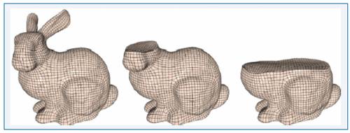 在计算力学中会经常用到六面体网格来进行有限元分析。我们也可以使用共形映射生成一个网格曲面的规则六面体网格,并且具有尽量少的奇异点和奇异线。图4是在一只兔子模型内部生成了比较好的六面体网格。根据拓扑学理论,生成六面体网格时通常会产生一些奇异点。基于叶状结构理论,我们对这些奇异点进行分类,并进行了一些深入的研究,从而得出了一些在计算机科学上有意义的结论。