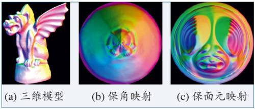 我们将大卫雕像模型(如图1(a))共形(保角)地映射到平面上(如图1(b)),看上去似乎变化很大,其实不然,因为这是保持角度不变的。如果我们在参数区域平面上画好网格点,然后将这些网格点映射到人脸上,就能在人脸上显示出很漂亮的网格图形(如图1(c))。共形映射在工程中应用很广,因为它能将图上的无穷小圆仍然映射成无穷小圆,从而不会导致太大的变化。