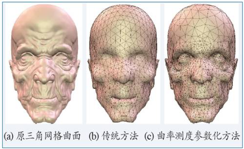 数字几何处理中一个很重要的问题是几何压缩。在进行几何压缩时需要用到蒙日-安培理论和几何逼近理论。如何压缩复杂几何数据,保证几何误差最小,并同时保证黎曼度量、曲率测度和微分算子的收敛性,这就是几何压缩问题。我们采取的解决方法是用共形映射将曲面映射到平面,再用蒙日-安培理论,将高曲率区域放大,然后重新采样,并在共形参数域上进行Delaunay三角剖分。这样得到的简化多面体网格就能够保证黎曼度量、曲率测度和微分算子收敛。采用不同的几何压缩方法将图5(a)所示的三角网格压缩到4000个顶点所得的结果如图5(b)和图5(c)所示。