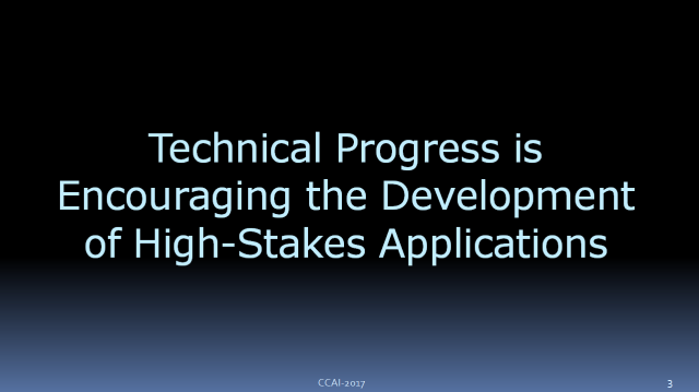 近年来,人工智能在技术上的长足进展,让我们可以考虑一些高风险领域的进一步应用,比如无人驾驶、自动帮医生做手术的外科手术机器人,还有在金融市场从事自动化交易的人工智能,另外还有一些基础设施相关的人工智能,比如我的同事正设法用人工智能来提升电网的管理效率。