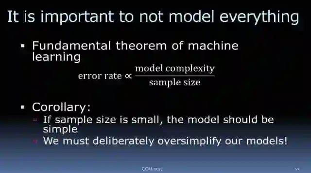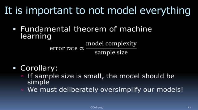 我们都知道,机器学习关于错误率的基本理论是,模型的出错率与其复杂程度成正比,与样本的大小成反比。如果数据量很小的话,我们就不能用特别复杂的模型,尤其是深度网络,因为它们相当复杂。其后果就是,在样本很小的情况下,我们的模型就必需非常简单。我们的模型要比现实世界简单,尽管这一点大家心知肚明,但我们还是要使用简单的模型。我们必须慎重地模型,因为这是优化预测准确度的方法。