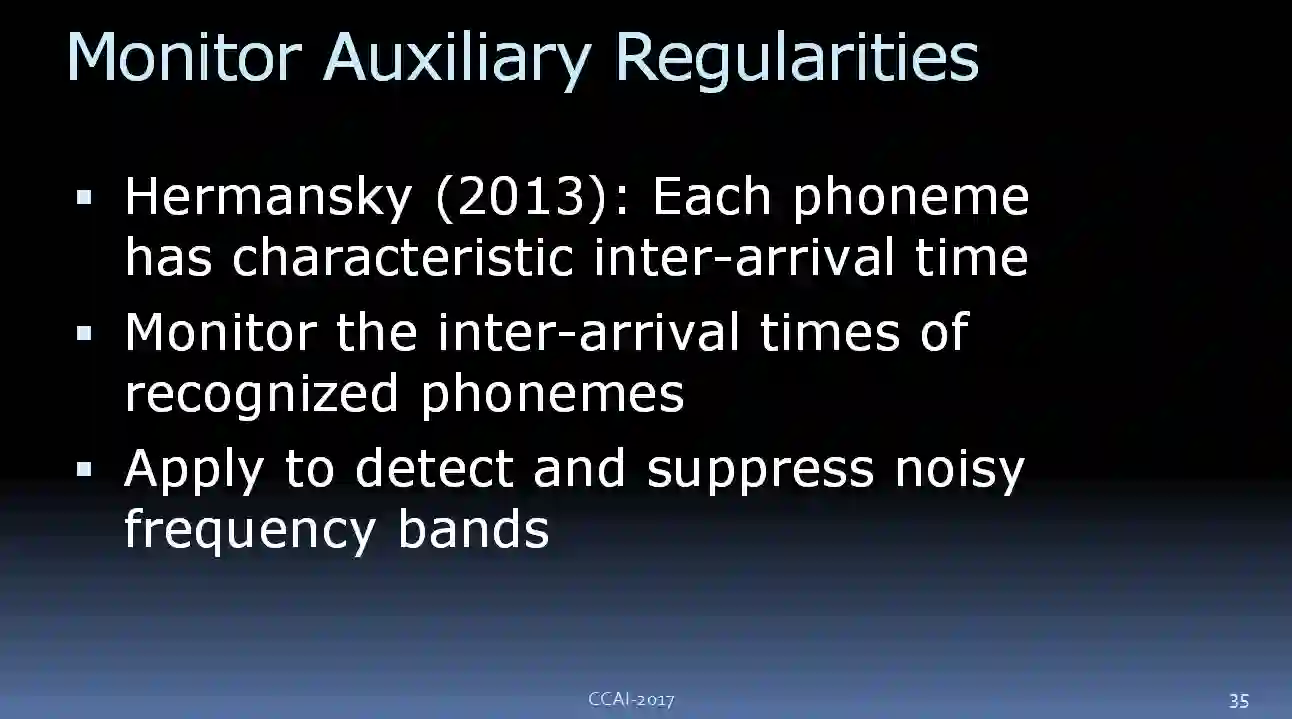 另外一件可以做的事就是监测辅助规律。Hermansky 写过一篇很有意思的论文,是关于语音识别的里面的未知的未知。在做语音识别的时候,你可以为不同的频段,比如低频、中频、高频,训练单独的识别器。在自然语言中,你发出的两个音节之间是有时间间隔的,因此我们可以监控这些间隔时长。如果我们发现分类器给出的分布结果和我预期的差别很大,那么我们就可以探测哪个地方出了问题。