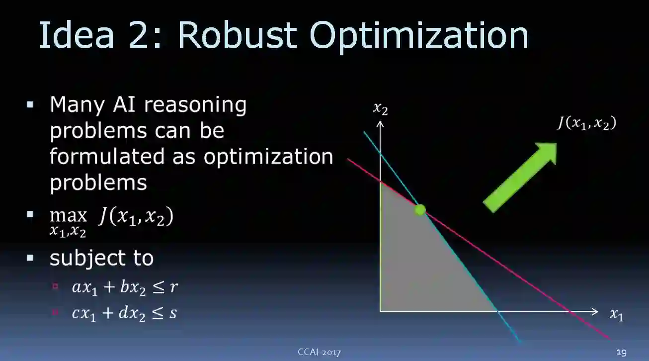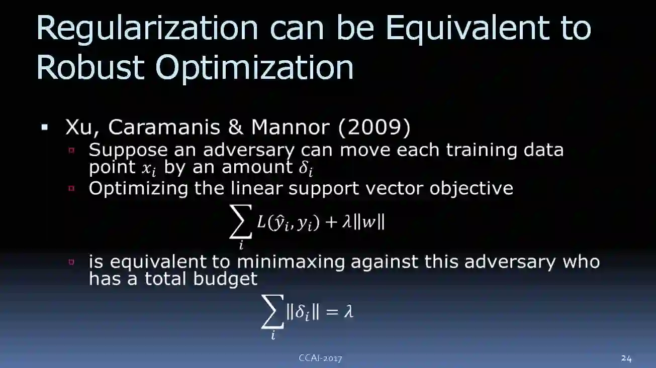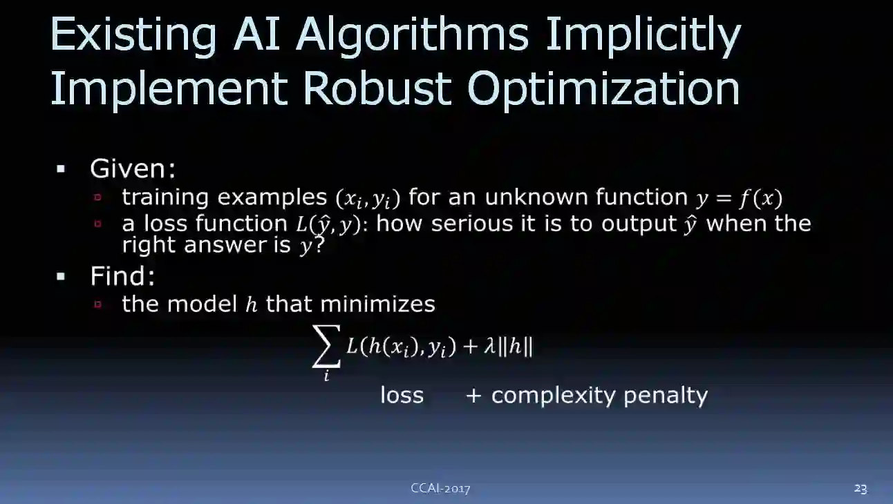 现在有一些非常有趣理论:现有一些 AI 算法是可以被看作鲁棒性优化的。其中一个例子是支持向量机监督学习设置。我们给一些未知函数 y = f(x)训练样本,并且给出了一个损失函数 L(y(hat),y),当正确答案为 y 时,观察输出 y(hat)。