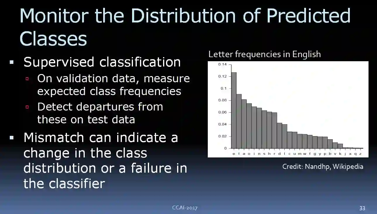 比如,我们可以监测预测类别的分布。试想一下,我们在做手写字符的识别系统,在英语里面,我们知道字符其实是有一定的分布频率的:最常见的英语字符是“E”,第二常见的是“T”等等。我们可以观察一下模型的分类器,看看预测的分布是怎样的,如果两者相差很大,那么很可能是出了问题。