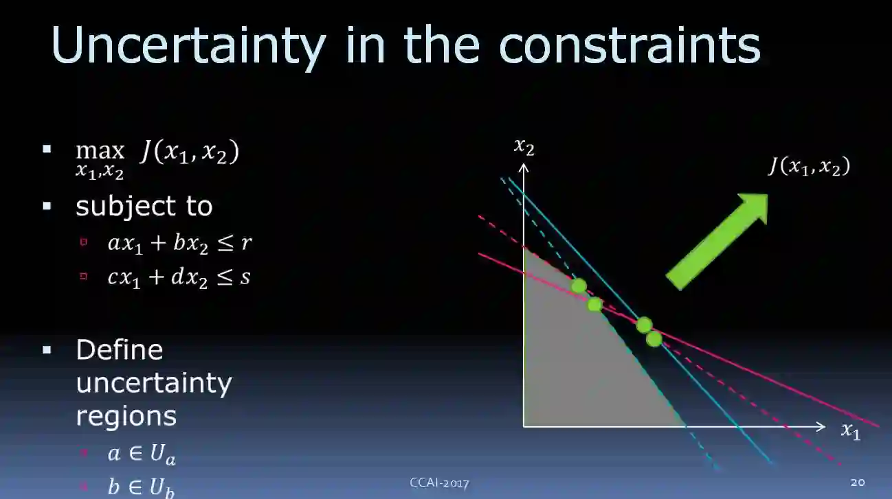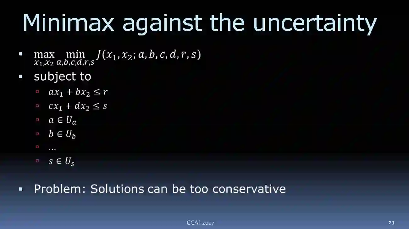 其中一个方案是使用极小化极大算法(一种找出失败的最大可能性中的最小值的算法)来消除不确定性。我们有 adversary,并允许从不确定集合中选择a、b等常量的值。为了最大限度地较小我们可以实现的最佳目标,在选择目标之后,将其最大化,我们便可以得到稳健的解决方案。然而这种方案太过保守。